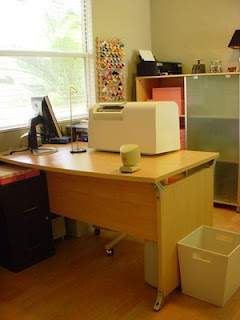 This room is off the living room, so I can keep an eye on my little one and/or whatever is going on in the main part of the house, but the French doors keep the mess confined and little fingers out of everything. Even though the room is only 10x10, there’s surprisingly enough space for all of my supplies, as long as I keep them organized. When I neglect clean up duty, it doesn’t take much for the space to be ridiculously cluttered and nearly unusable. My reward for my hard work on Elle Belle in the last couple of weeks was to clean my space… yep that’s a reward. When encouraged to find their "happy place" some people go to the beach, others maybe a mountain top, but for me, one of MY most happiest places of all is creating whatever strikes me at the moment in my impeccably clean, super organized craft space with female artists (think Nelly Furtado, Pink, Natasha Bedingfield, Tatu) playing loudly on the computer via Pandora.com. I kept my “happy place” in mind as I spent 5 full hours cleaning, reorganizing, and rejuvenating my space this weekend.